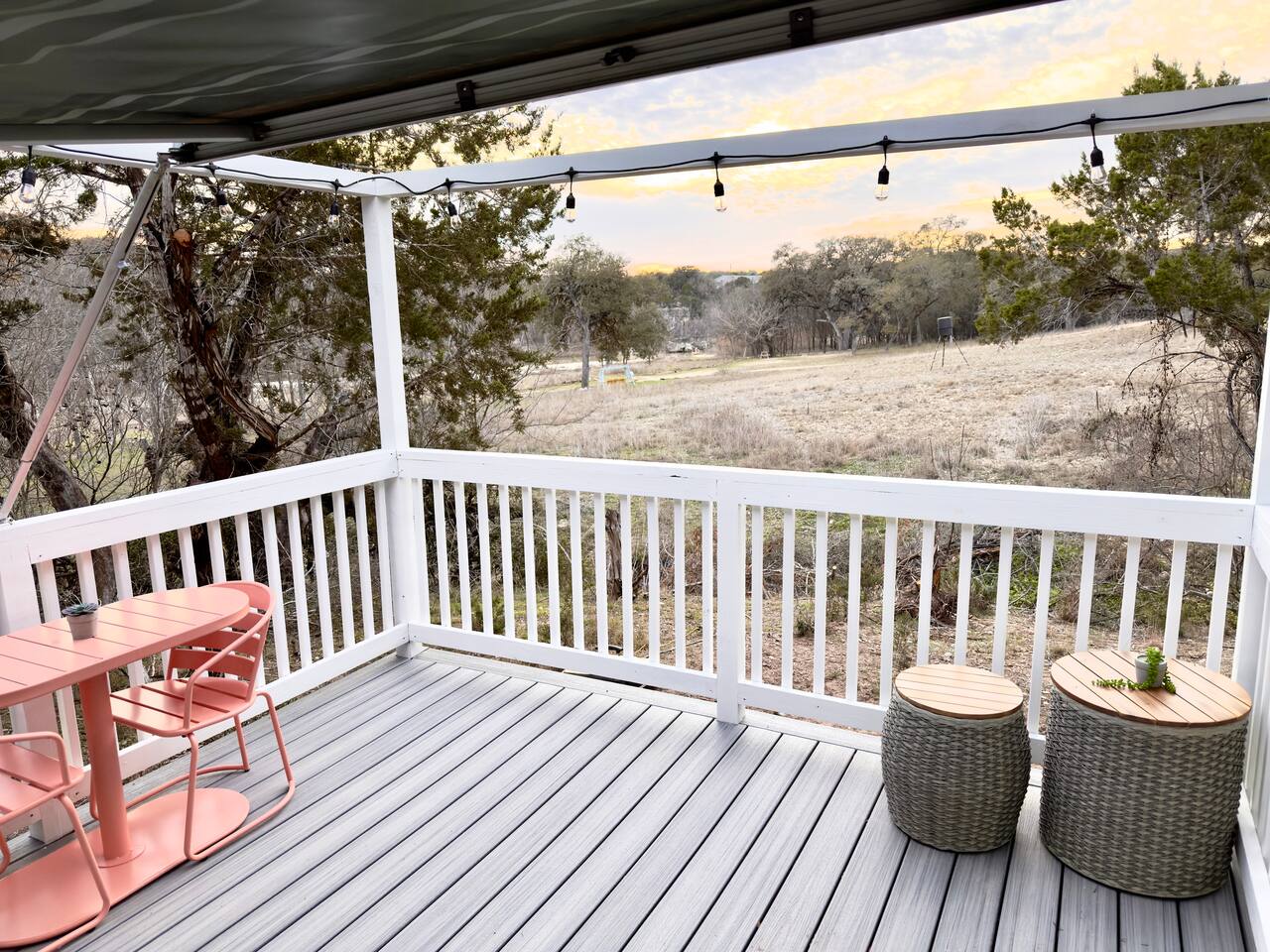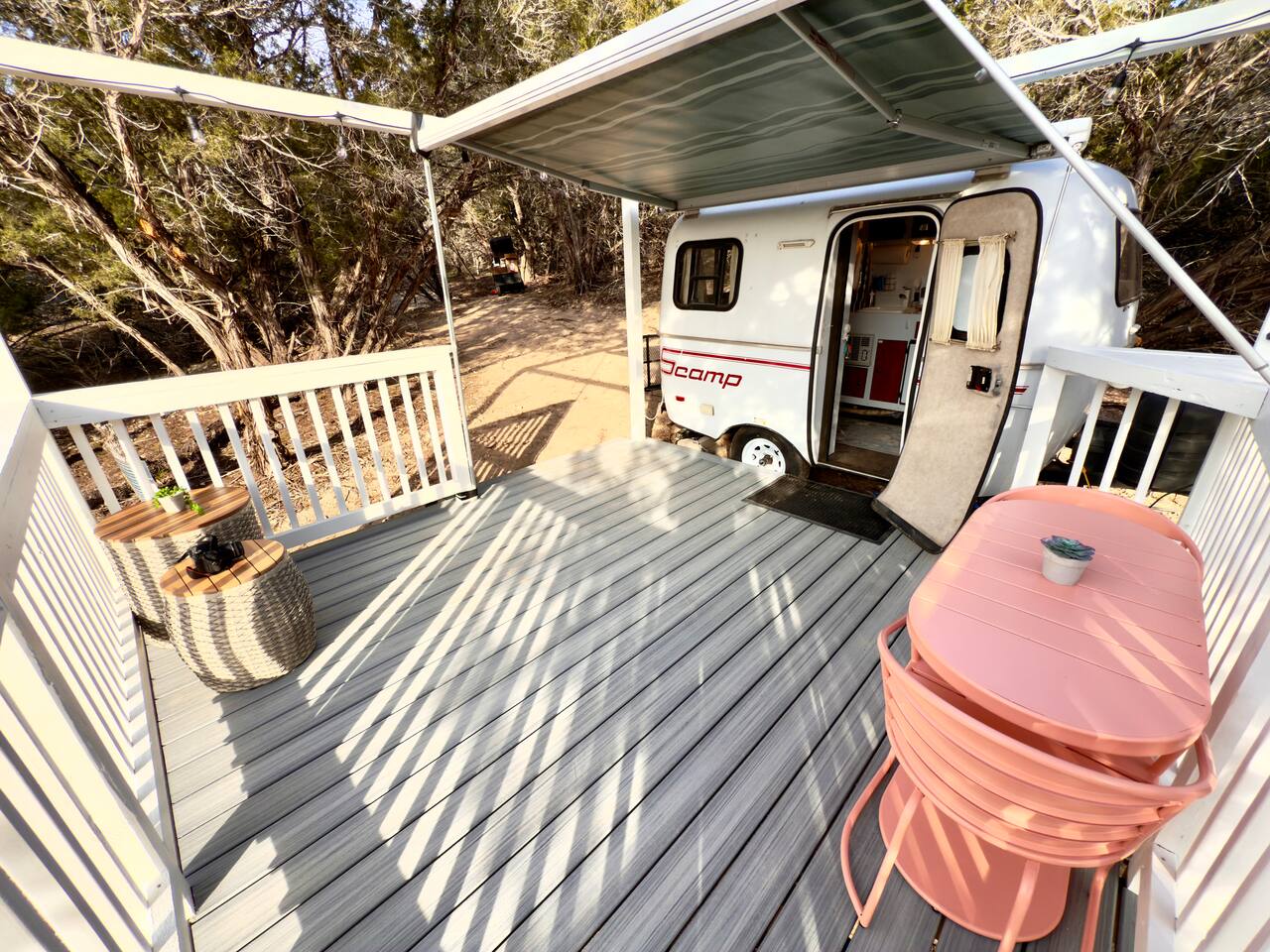 Tucked beneath shady cedar trees at Sparrow Bend, La Palomita is a lovingly restored vintage Scamp trailer made for peaceful escapes. Inside, a comfy bed and kitchenette offer cozy simplicity. Outside, unwind on your private deck under string lights, with a dining nook and outdoor sink. Clean shared restrooms are steps away. Wander down to the spring-fed Medina River for a refreshing swim or quiet moment by the water. Perfect for couples or solo travelers seeking soul-soothing nature.